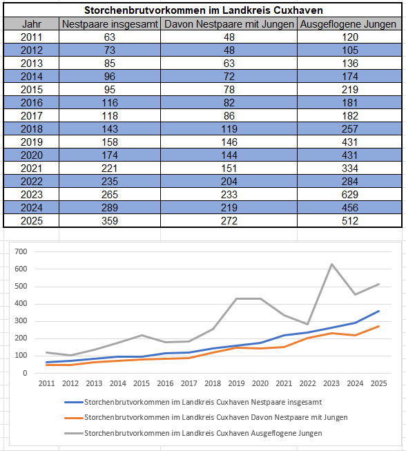4000 und 4500 Jungstörche ausgeflogen. Im Vorjahr waren es ca 4100 Jungstörche. Dabei ist der Bruterfolg pro Paar etwas geringer ausgefallen. In den Landkreisen Cuxhaven, Verden, Wesermarsch, sowie die Region Hannover gibt es die meisten Störche.